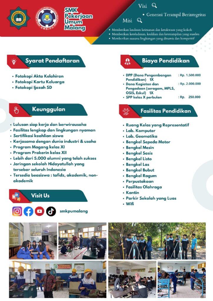 SMK Pekerjaan Umum Malang. Tempat lahirnya generasi terampil, disiplin, dan berdaya saing tinggi untuk masa depan bangsa Indonesia.