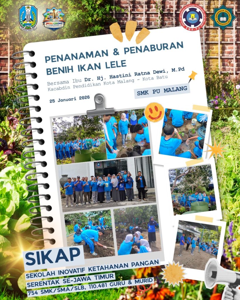 Malang – SMK Pekerjaan Umum Malang berpartisipasi mengikuti kegiatan menanam dan menabur benih serentak Program SIKAP (Sekolah Inovasi Ketahanan Pangan) pada Ahad (25/1/2026) yang diselenggarakan oleh Dinas Pendidikan Provinsi Jawa Timur bersama Ibu Gubernur Jawa Timur, Dr. Hj. Khofifah Indar Prawansa, M.Si.
